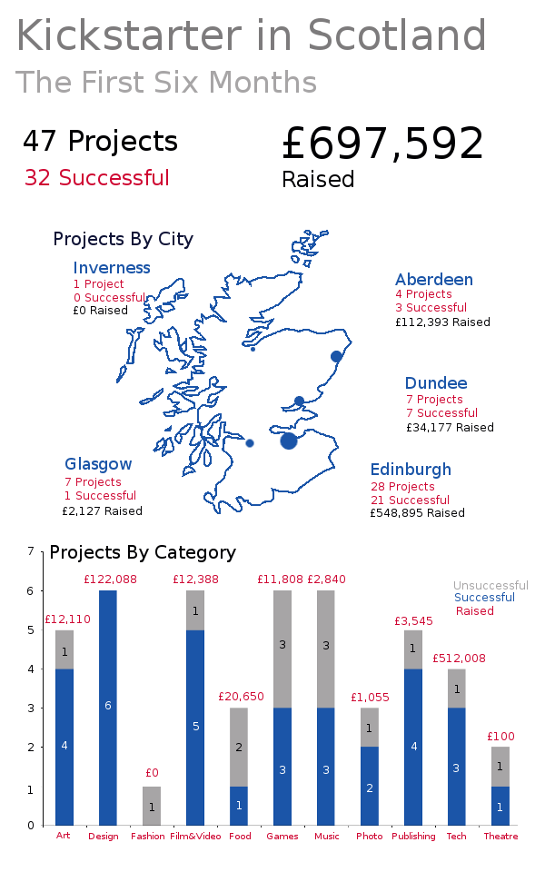 By city, Dundee is the most successful in that all 7 projects launched there were successful, but it is Edinburgh that has raised the most with some 21 successful projects from 28 raising £548,895