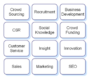 Well, marketing is an important aspect of the application of Social Media in the work place but consider the graphic below to reflect just a few of the other applications for Social Media – each of which is a key component in value generation for businesses.